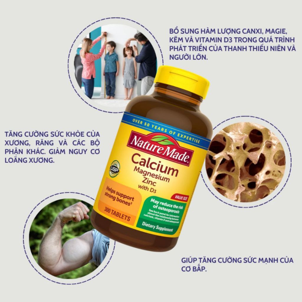 Đặc biệt thiết kế 300 viên/hộp tiết kiệm chi phí, Nature Made không chỉ bảo vệ toàn diện khung xương mẹ bầu mà còn là "vệ sĩ" chống gãy xương cho người già, đồng thời hỗ trợ phát triển chiều cao vượt trội ở tuổi dậy thì.