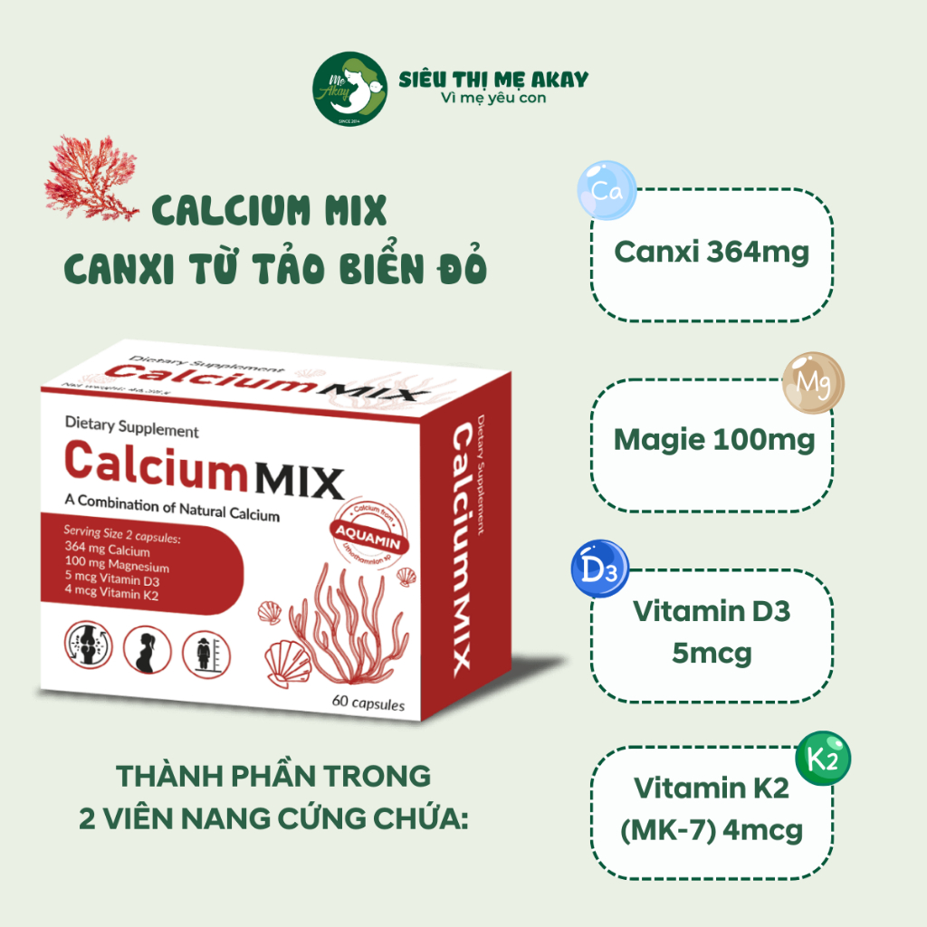 • 🔹 Aquamin từ tảo đỏ – "Kho báu" khoáng chất Đại Dương: Chứa 70+ vi chất (kẽm, selen, đồng...) cân bằng tự nhiên, giúp tái tạo mật độ xương cho mẹ bầu và nuôi dưỡng khung xương thai nhi ngay từ tuần thai thứ 8.