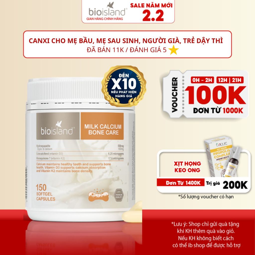 Canxi Sữa Hữu Cơ Bioisland là "trợ thủ đắc lực" cho mẹ bầu, trẻ vị thành niên và người lớn tuổi đối mặt với nỗi lo thiếu hụt canxi. Với nguồn gốc từ Úc, sản phẩm sở hữu công thức 3 trong 1 độc quyềnHydroxyapatite (canxi hữu cơ tinh khiết từ sữa bò), kết hợp vitamin D3 và K2-MK7 giúp tối ưu hóa hấp thu canxi vào xương, ngăn ngừa lắng đọng ở mô mềm.