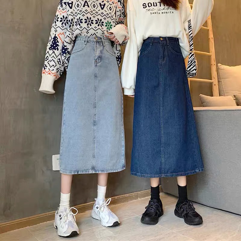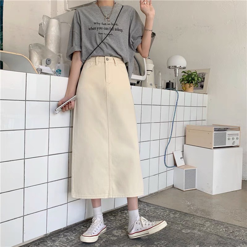 1. Chân váy jean dài KABICO cạp điều chỉnh độ rộng bụng phong cách, váy jean dáng dài cạp cao thanh lịch A14