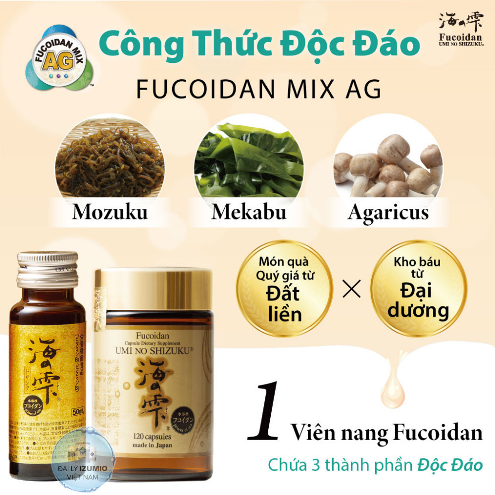 Viên Uống Fucoidan Vàng Umi No Shizuku là một sản phẩm độc đáo với công thức "Fucoidan Mix AG", kết hợp Fucoidan từ tảo Mozuku và Mekabu cùng với nấm Agaricus Brazil.