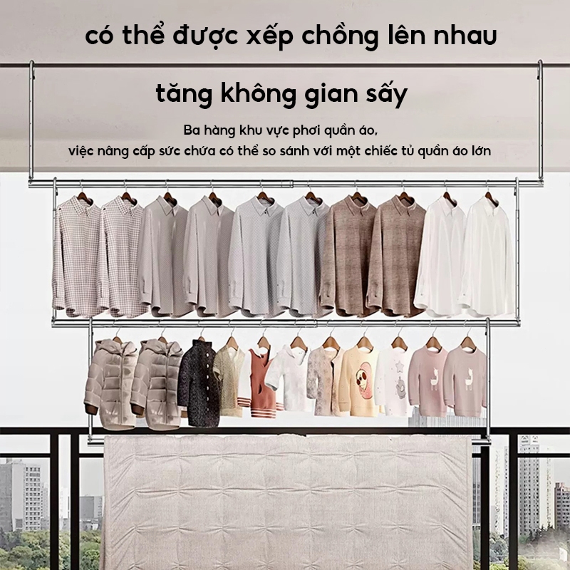 Thiết kế “2 trong 1”: Vừa phơi được 120 bộ quần áo (tương đương 30kg), vừa treo 4 chăn bông cỡ lớn mà không lo võng thanh.