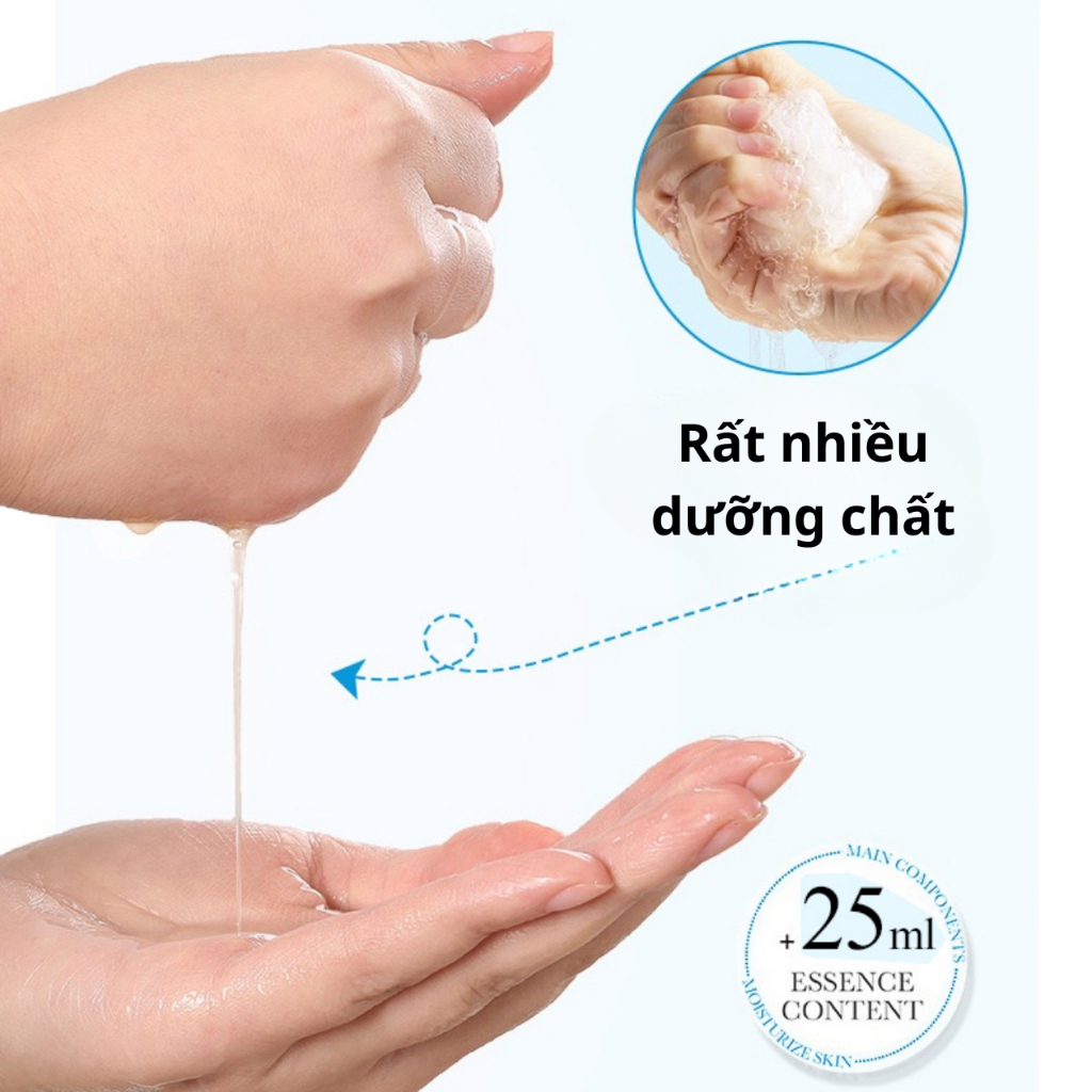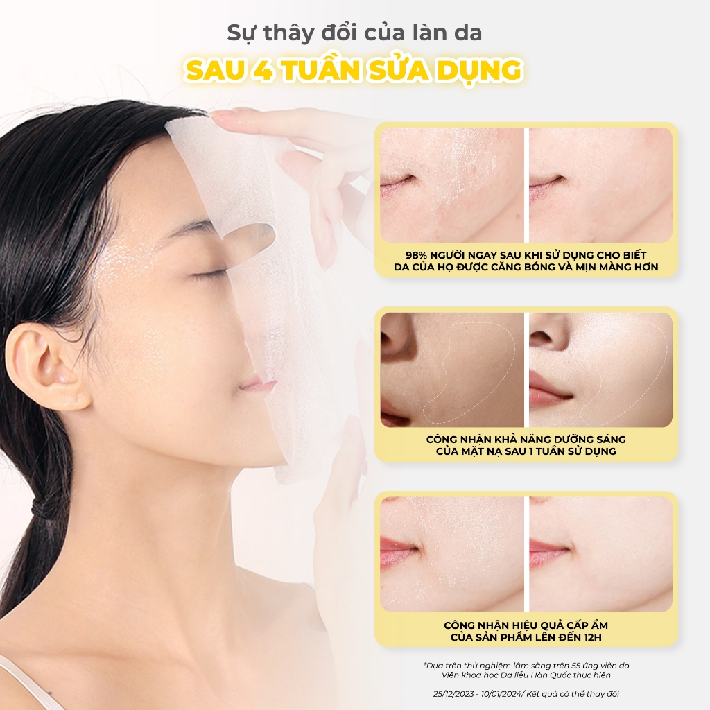 • Thiết kế lụa sinh học 2 lớp: Chất liệu mỏng 0.01mm ôm sát 100% đường nét mặt, ngăn serum trôi khi đắp – hiệu quả thẩm thấu cao gấp 2.5 lần mặt nạ giấy thường