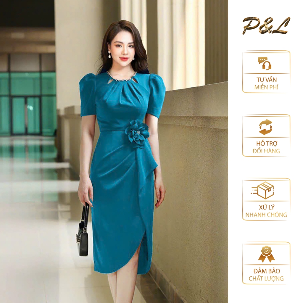 4. Váy Đầm Dự Tiệc Trung Niên BigSize Đi Cưới Thiết Kế Cao Cấp Đầm Đi Tiệc Cổ Tròn Phụ Kiện Bông Eo PL7
