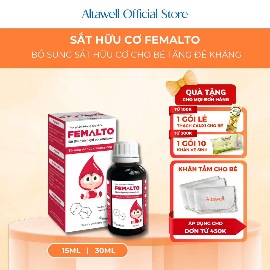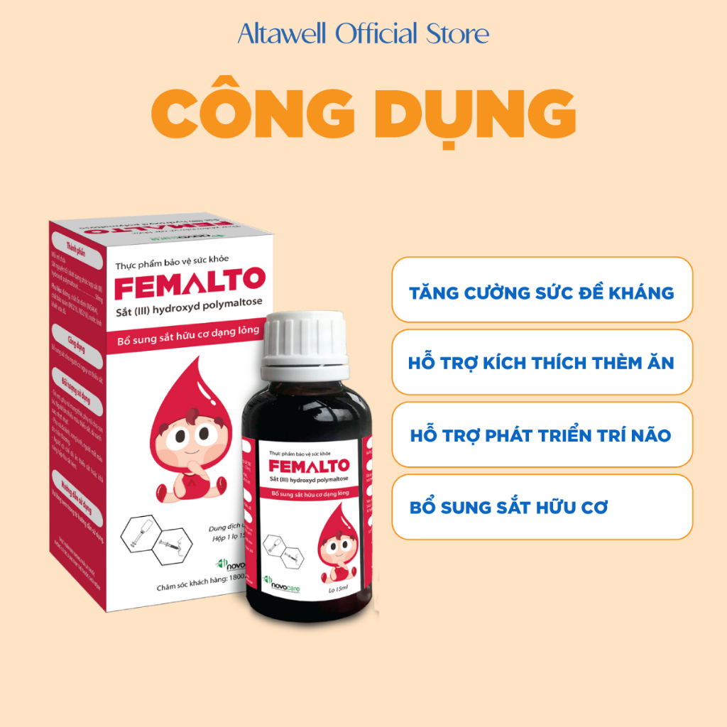 Sắt hữu cơ Femalto Novocare là giải pháp bổ sung sắt hiệu quả cho trẻ, đặc biệt là những trẻ sinh thiếu tháng hoặc thiếu cân. Sản phẩm này chứa 50mg sắt trong mỗi ml, giúp tăng cường đề kháng và phát triển trí não cho trẻ.