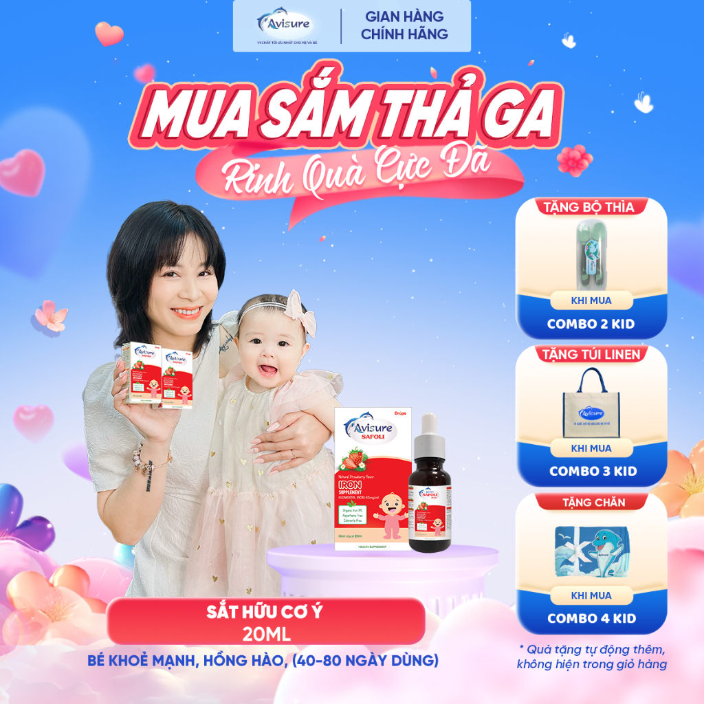 Sắt hữu cơ Avisure Safoli Drops là giải pháp bổ sung sắt hiệu quả cho trẻ, với cấu trúc tương tự Feritin máu, giúp trẻ hấp thu sắt một cách chủ động mà không gây dư thừa. Sản phẩm có vị dâu dịu nhẹ, không tanh, không táo bón, không nóng, giúp trẻ dễ dàng hợp tác khi uống.