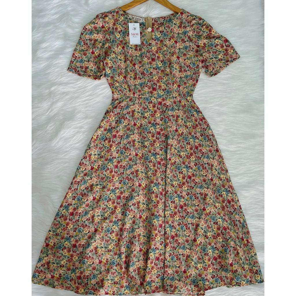 5. (Size M-3XL) Đầm xòe họa tiết hoa, cổ giọt nước, đính nút, có túi S&M trung niên tặng mẹ GR0279 (Hình thật shop chụp)